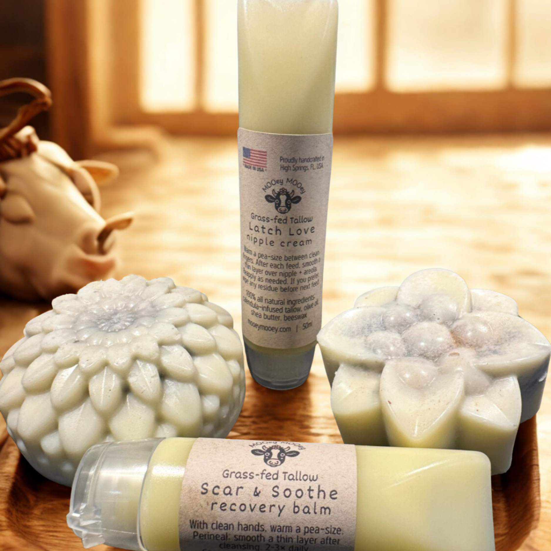 Made small-batch in Florida with grass-fed tallow and gentle botanicals, each item is formulated with plain-spoken safety and supportive care in mind. It’s a thoughtful shower gift, a smart hospital-bag add, and a steady routine for the first weeks at home. For best results, follow each product’s safety notes and your provider’s guidance.
